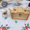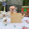 Ấm xinh vừa 15cm bề ngang và cao 12cm đúc như một tủ cabinet màu vàng nâu bày âu trắng nổi đẹp xinh hoạ tiết hoa hồng cổ.