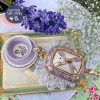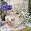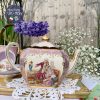 Ấm tình nhân Sadler – HÀNG SĂN LÙNG, tông tím liac và ren vàng vẽ đè lên tông tím. Đôi chim cu đang ru dương trong tiếng nhạc và ánh đèn hắt bóng của cô gái.