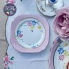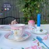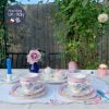 Bộ tách cho 2 người của nhà gốm xưa Anh c.1950 Bell China với tách dáng xinh xắn trên nền hoa phăng hay hoa bươm bướm nhẹ nhàng xanh, vàng, hồng hoà hợp với dải men hồng cẩm thạch viền miệng tách, đĩa .