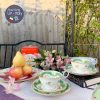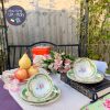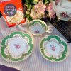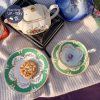 Trên nền gốm trắng trung tâm, nổi lên hoạ tiết vẽ tay của bông hồng rất đỗi Anh điểm vài hoa nhí xanh Forget-me-not yêu thích của thời nữ hoàng Victoria. Phong cách trang trí gốm tỉ mỉ & chi tiết này đúng kiểu Rockingham hay theo lối Rococo thăng hoa tiệc trà.