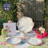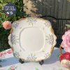 * 2 đĩa ăn bánh/ hoa quả vuông với góc cách điệu tỉa tròn tạo sự tương phản với đĩa lót tách tròn bắt mắt