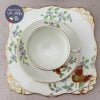 Nhẹ nhàng tinh tế nền sứ ngà kem với hoạ tiết hoa lá xanh tím và hồ điệp nâu ánh vàng dập dìu vẽ tay của nghệ nhân.