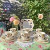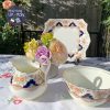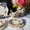 Men gốm màu kem như kem của bánh dành cho trà chiều kiểu Anh (clotted cream scone) & hoạ tiết vẽ tay tô màu những cánh hoa cam, những dải lá xanh non nhè nhẹ thoáng nổi bật xinh xen với lá nâu tạo thành 1 dải hoa lá quanh tách. Đường bo chia khối cho tách với những dải tam giác xanh Cobalt & tô điểm xanh lá non lé sáng mạ vàng & dải vẽ vân tay đối xứng bên dưới như những mảng ren nâu nhẹ tạo không gian hút mắt nhìn vào thân tách, đĩa.