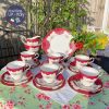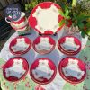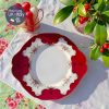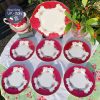 Đĩa lót & đĩa ăn bánh phần gốm trắng được vẽ chu đáo 3 góc hoa hồng tạo phân khu độc đáo trên viền bo hồng đỏ & toả sáng tách đặt lên.