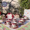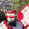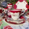 Viền bo Paragon hồng đỏ vẽ sóng và phân cách sứ xương trắng bởi đường vẽ nâu nhẹ & bông hồng kèm hoa nhỏ xanh lưu ly với dải lá & nụ xanh lá cây & thấp thoáng lá sẫm màu nâu xanh xinh xắn hiện ra.