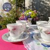 Nụ hồng xinh tươi chúm chím như cô dâu viền quanh miệng tách & vành đĩa lót, với chân tách nhô cao nằm gọn trong lòng đĩa lót.