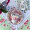 Bông hồng tròn trịa bắp cải cánh cúp đi kèm thấp thoáng hoa lưu ly tím & những lá xanh điểm xuyến chen lá vàng xinh xắn bo quanh miệng tách, đĩa rạng ngời bàn tiệc.