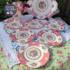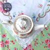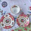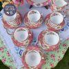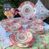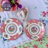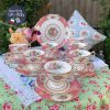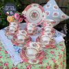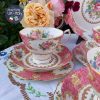 Set tách màu hồng đẹp rực rỡ phong cách trà chiều kiểu Anh với hoạ tiết hoa hồng và hoa liti xanh tím vàng quyến rũ.