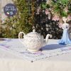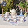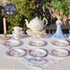 Hoạ tiết hoa cẩm tú cầu Carousel sắc màu hồng, xanh, tím của nhà gốm Royal Stafford tạo không gian bàn tiệc sum xuê và lung linh với cách mạ vàng viền ánh và nhoè dần như bọt xà bông. Cách mạ vàng 22kt là signature của nhà gốm Anh.
