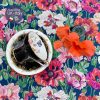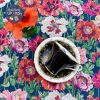Đen huyền bí với dáng tách quyến rũ như thon eo cô gái với viền mạ vàng quai cầm tròn đầu như cô gái đang chống tay vào eo & đoá hoa Poppy vàng cam, đỏ xanh nở trong lòng tách.
