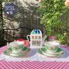 Bộ tách trà cổ dành cho đôi uyên ương với những nét vẽ điêu luyện chim lạ trong từng khuôn vẽ đẹp rạng rỡ trên nền gốm xanh tươi mởn sáng. Cách trộn màu rất tài tình của nhà gốm này.