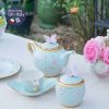 Tông màu xanh bạc hà là tông màu đem đến cảm giác thanh bình, nhìn là muốn toả lòng, lạc quan khi kết hợp cùng tông hồng nhạt thể hiện sinh động trên hoạ tiết nổi đúc cánh bướm trên tay cầm và ẩn hiện quanh ấm, hũ đường, vành đĩa bánh.