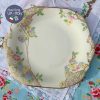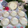 Những cành hoa hồng, vàng & xanh nước biển tông pastel được vẽ tay và trang trí trên nền sứ xương màu vàng kem nhãn mắt như hoa xuân đang hé nở với những điểm lá xanh non và những bông hoa mai mạ vàng vẽ thấp thoáng trên nền ren vàng gần miêng cốc và tay cầm.