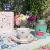 Bộ tách tặng mẹ đẹp xinh ghi chữ Mother thân thương gồm tách và lót tách với dải ruy băng xanh mãn nhãn và đoá hồng 2 sắc màu hồng và vàng hiện lên sống động.