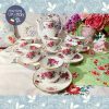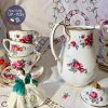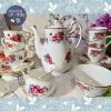 Dải hoa hồng Chelsea Staffs xen lá xanh quyến rũ, đẹp lạ với nụ hồng to nhỏ xung quanh tách, lót tách và ấm & nổi bật với viền mạ vàng dày dặn vừa phải.