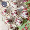 Dải hoa hồng Chelsea Staffs xen lá xanh quyến rũ, đẹp lạ với nụ hồng to nhỏ xung quanh tách, lót tách và ấm & nổi bật với viền mạ vàng dày dặn vừa phải.