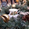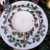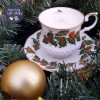 Tách nến Rosina Queen Xmas với hoạ tiết lá Holly xanh quả đỏ & quà thông cuốn quanh đĩa tách.