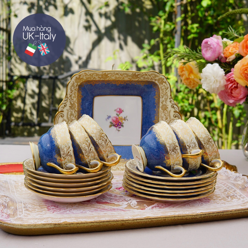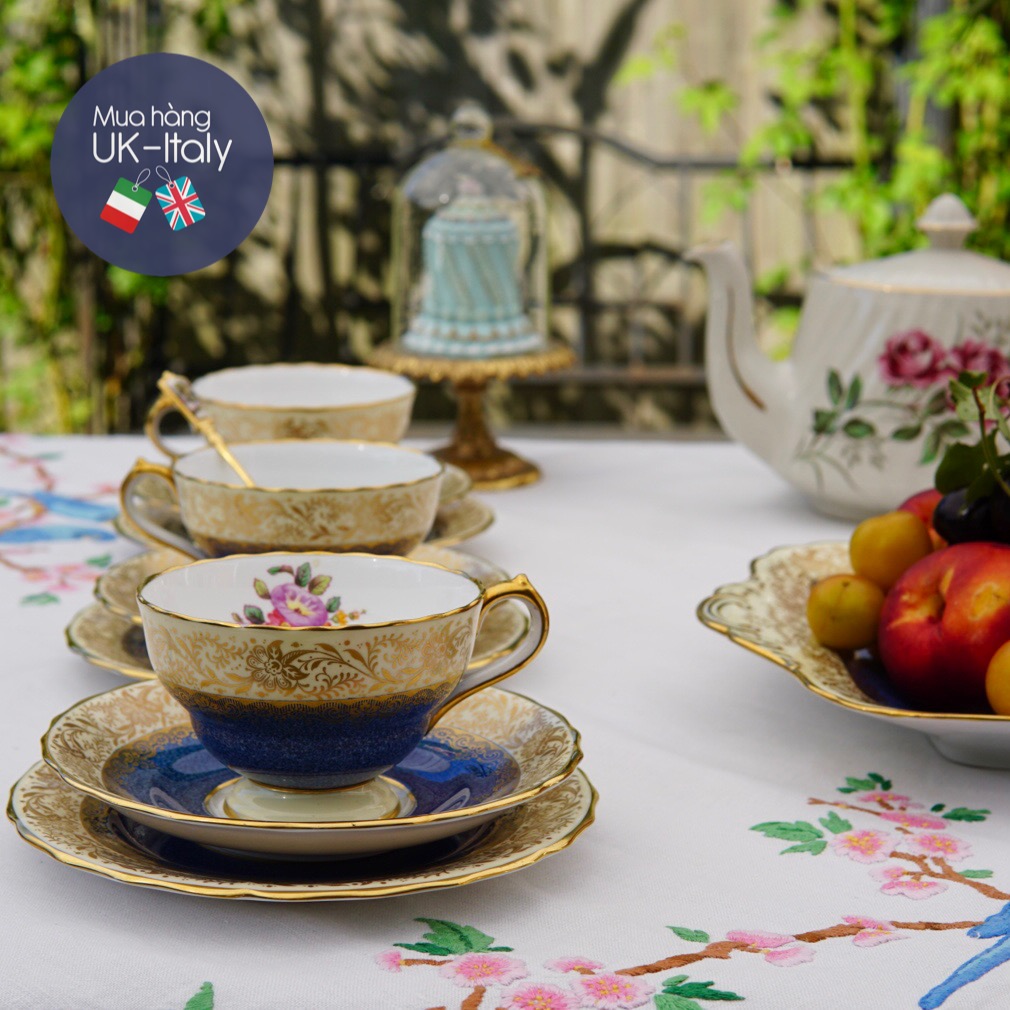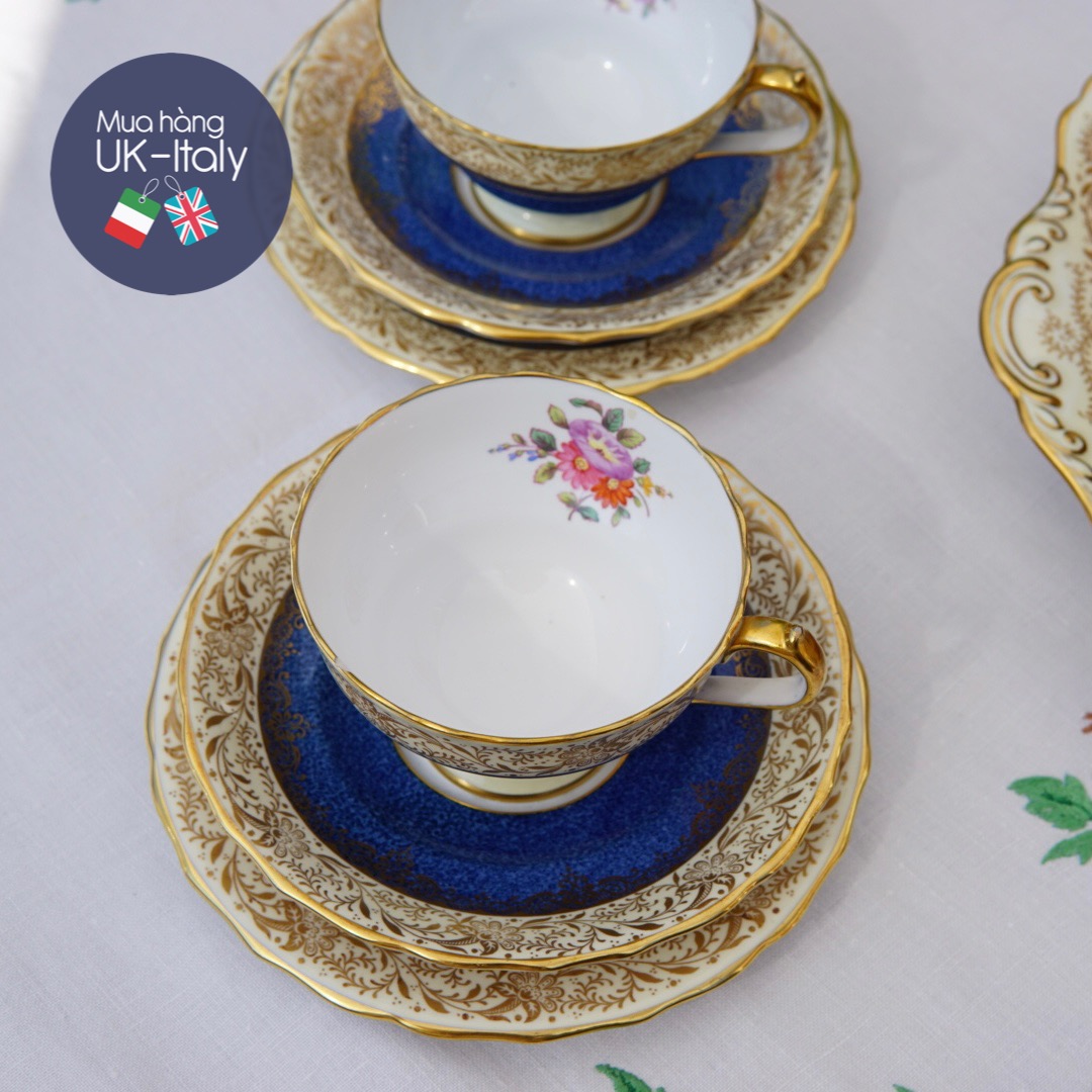 Bộ tách Spode Ruskin xanh cobalt vàng kem hoa hồng cho 6 người (3 lựa chọn).