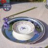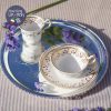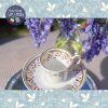 Những bông hoa lưu ly được vẽ mạ vàng 22kt hoàn toàn mặt ngoài tách chạy quanh thân tách. Dáng tách với tên gọi nhà nghề là Estrucan miệng rộng mở loe nhẹ với đường gốm đáy nhô 1mm để thấy dánh tách & hoa vẽ rạng ngời của đĩa lót. Điểm đặc biệt của bộ tách true trio này là tay cầm đúc được đúc khéo léo 1 chú rắn uốn vồng ngoạm lấy miệng tách và trên tay cầm ấy mạ vàng rất nghệ nhân.