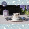 Bộ tách TRUE TRIO Antique c.1830 với gốm trắng nhẹ, thanh của nhà gốm được cho đã ‘hoàn thiện’ công thức gốm sứ xương Anh quốc cho bạn yêu hoa lá, đặc biệt những bông hoa chuông xanh tím. Hoa chuông xanh tím được nghệ nhân chuyên trách vẽ trên gốm thể hiện trên gốm trắng sứ xương trong miệng tách to, tách nhỏ và vành đĩa lót khiến bạn ngỡ hoa như trước mắt bạn. Rồi cảnh hoa chuông xanh mê hoặc Anh quốc được tưởng tượng lý thú như bạn đang ngắm đi dạo ven đường, bìa rừng và công viên tại Anh quốc tháng 4.