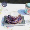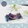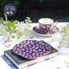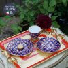 Khi đi tìm những bộ tách Chintz, ngỡ ngàng bạn đang ngắm bộ tách với men gốm xanh cobalt đậm rất hoàng gia điểm những bông hoa mai đỏ mạ men nổi và xen lẫn bông mai mạ vàng 22kt mà thoáng có vẻ đẹp của thời hiện đại nay trong những mẫu vải hoa may áo dài hay vải thiết kế hoạ tiết sặc sỡ hoa lá ngày nay. Chiếc tách với dáng Smooth Shape mềm mại nhẹ mở tròn và quai cầm phẩy góc với mạ vàng kín kèm điểm đúc quai vuốt rãnh nhỏ lan vào thân tách tao nhã đặt trên lót tách vồng nhẹ khiến tách đứng vững trãi khi dùng. Đĩa ăn bánh được tạo khuôn vuông vạt 4 góc duyên dáng tạo sự giao thoa hài hoà tổng thể đất -trời khi chồng xếp tách/ lót tách/ đĩa ăn bánh lên nhau.