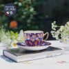 Khi đi tìm những bộ tách Chintz, ngỡ ngàng bạn đang ngắm bộ tách với men gốm xanh cobalt đậm rất hoàng gia điểm những bông hoa mai đỏ mạ men nổi và xen lẫn bông mai mạ vàng 22kt mà thoáng có vẻ đẹp của thời hiện đại nay trong những mẫu vải hoa may áo dài hay vải thiết kế hoạ tiết sặc sỡ hoa lá ngày nay. Chiếc tách với dáng Smooth Shape mềm mại nhẹ mở tròn và quai cầm phẩy góc với mạ vàng kín kèm điểm đúc quai vuốt rãnh nhỏ lan vào thân tách tao nhã đặt trên lót tách vồng nhẹ khiến tách đứng vững trãi khi dùng. Đĩa ăn bánh được tạo khuôn vuông vạt 4 góc duyên dáng tạo sự giao thoa hài hoà tổng thể đất -trời khi chồng xếp tách/ lót tách/ đĩa ăn bánh lên nhau.