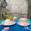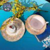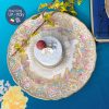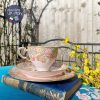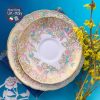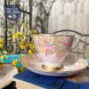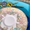 Nền sứ xương hồng phớt nhẹ được nghệ nhân Tuscan vẽ tỉ mỷ những dải ren mạ vàng kín mặt ngoài tách và quanh đĩa lót, đĩa bánh. Sau đó người nghệ sĩ gốm hãng dùng kĩ thuật vẽ men nổi phủ tông màu tạo bức tranh hoa và chim ruồi nổi bật rạng rỡ với tông men xanh ngọc lam và hồng, tông màu tạo sự bắt mắt mĩ mãn & không khiến người sở hữu hạnh phúc, niềm vui trào dâng.