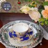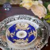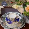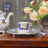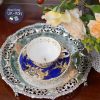 Có quá nhiều điều để dành cho bộ trà trio đúng nghĩa tuyệt tác này. Nào ta cùng bắt đầu với dáng tách trước. Đây là dáng tách đặc trưng của Coalport – nhà gốm đại thụ của gốm sứ xương UK với miệng tách đúc kĩ càng tinh vi uốn lượn & nổi vành. Hình dáng tách này có tên gọi là Pembroke. Khuôn đúc quai cầm cũng tỉ mỉ không kém & nghệ sĩ tạo khuôn phải tính toán rất kĩ càng để khuôn tay cầm được chắc chắn & trong quá trình nung không bị gãy. Về phần men gốm thì thật sững sờ bởi tông men trộn xanh cobalt sáng lạ lùng & phần tài năng nhất của nghệ sĩ vẽ gốm nằm ở những khoang vẽ cảnh khiến ta chìm đắm nín thở ngắm. Rất ít bộ gốm nào vẽ cảnh mà có cả người trên tách & sự sáng tạo mỗi cảnh làng quê thanh bình đều được thể hiện khác nhau trên tách, lót tách.