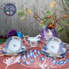 Hũ sữa & hũ đường được trang trí tông gốm trái ngược với tách màu gốm xanh lam tươi & hoạ tiết hiện ra ngoài.