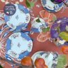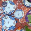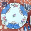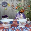 Tông gốm xanh lam tươi vừa với những đường vân như vảy cá chia khoang đối xứng trong lòng tách, xen kẽ với những chùm quả nho và hoa hồng rất đỗi thi vị khi nâng tách trà & chùm nho, bông hồng xinh xắn trong lòng đáy tác được hiện ra. Mặt ngoài tách gốm trắng nón & chỉ điểm motif hoa hồng với nho để thấy sự đơn giản nhưng không hề giản đơn của thiết kế c.1950.