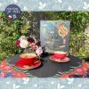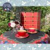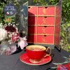 Men màu đỏ phủ kín ngoài tách với khuôn đúc tạo cạnh bạn cầm ôm tách cảm nhận thích thú, quai cầm mạ vàng kín uốn nhẹ không hề dễ đúc để tạo độ cân bằng quai và thân tách & đặc sản của hãng – hoạ tiết quả sinh động như thật hiện kín lòng tách mang dáng vẻ cổ điển, tiệc trà thăng hoa.