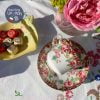 Vườn hồng cổ tông hồng hồng đậm tươi & lá xanh mướt mơn mởn trên viền bo gốm đỏ & rạng rỡ khi có đường mạ vàng 22kt điểm chấm miệng tách, quai & vành đĩa.
