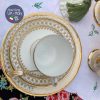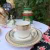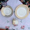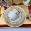 Nền sứ xương nhẹ trắng ngà của tách và đĩa trang nhã với hoạ tiết mạ vàng 22ktc kín quanh miệng tách, vành đĩa phong cách nghệ thuật.