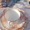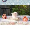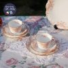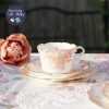 Với gốm Âu, sự khuôn mẫu & kĩ thuật luôn tồn tại song hành với các hãng gốm. Trong khi đó, gốm Anh hoàn toàn khác hẳn. Sự sáng tạo & chủ đề của gốm Anh bao la. Bạn yêu gốm sẽ không thể biết được có cụ thể bao nhiêu mẫu, tông màu & chất gốm mỗi nhà sản xuất theo công thức khác nhau. Bộ trà cổ c.1910 như bạn thấy là 1 minh chứng cho sự khác biệt. Hoạ tiết hoa cúc dịu dàng lan toả tông màu men má hồng trên nền gốm trắng tinh khiết rất cổ điển như hoạ tiết Toile De Jouy. Dáng tách rất thanh không cầu kì có hình học thang đứng & tay cầm đúc điệu đà với khuôn gốm tạo hình không đơn giản chút nào để tạo nên vẻ đẹp hài hoà cùng hoạ tiết & tông màu. Đĩa lót cong nhẹ như đài bông hoa với chú trọng chi tiết nổi gốm đúc lá cổ điển xen kẽ quanh đường gờ uốn. Mạ vàng phẩy nhẹ viền hoàn thiện thiết kế cổ thời Edwardian.