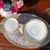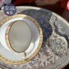 Với gốm trắng sáng thanh lịch như vậy, nét điểm tô không cần quá cầu kì mà chỉ cần 1 dải vẽ hoa tỉ mỉ của những bông hồng hồng tươi & lá hồng 4 cánh xinh xắn nối cùng hoa tạo thành 1 dải quanh thành tách/ đĩa lót đã show off toàn bộ vẻ đẹp của bộ trà này. Trong miệng tách được nhấn điểm bằng dải mạ vàng hình sò được vẽ tỉ mỉ từ hàng trăm chấm mạ vàng 22kt tạo nên vẻ sang trọng luxe.