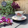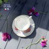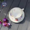 Những bông hoa đậu ngọt đỏ trầm & tím xanh xinh xắn trên tách & lót tách với viền xanh của màu lá vẽ trong lòng miệng tách & đĩa. Trong lòng tách có chữ Tháng 4.