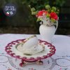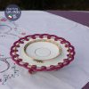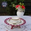 Với gốm trắng sáng thanh lịch như vậy, nét điểm tô không cần quá cầu kì mà chỉ cần 1 dải vẽ hoa tỉ mỉ của những bông hồng hồng tươi & lá hồng 4 cánh xinh xắn nối cùng hoa tạo thành 1 dải quanh thành tách/ đĩa lót đã show off toàn bộ vẻ đẹp của bộ trà này. Trong miệng tách được nhấn điểm bằng dải mạ vàng hình sò được vẽ tỉ mỉ từ hàng trăm chấm mạ vàng 22kt tạo nên vẻ sang trọng luxe.