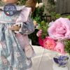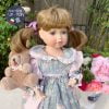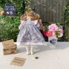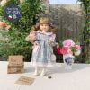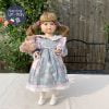 Búp bê váy hoa vintage cầm gấu bông xinh xắn. Tóc buộc 2 chòm với mái hỉ nhi nâu ánh.