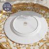 Bông hoa bươm bướm hồng trắng trên đĩa với mạ vàng và vành uốn sóng quanh đĩa.