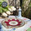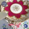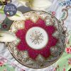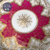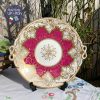 Chiếc đĩa với quai nơ đúc điệu đà, nổi gân gốm nơ cùng những đường vẽ tay mạ vàng điêu luyện kì công của thợ vẽ gốm tài năng thành những cánh lá hoa cách điệu đẹp sững sờ pha với tông đỏ hồng bắt mắt rất hiếm gặp đã là minh chứng cho tên tuổi nhà gốm này.