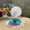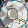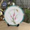 Chiếc đĩa với khuôn đúc vành nhiều công sức nhiều góc nghiêng mình quằn quại của nghệ sĩ để có những hạt chấm tròn như chiếc vòng ngọc trai đeo cổ nhãn mắt người xem rồi lần lượt tô từng hạt tông màu xanh ngọc lam sáng tươi trẻ & tiếp đến là đường gờ nổi mạ vàng dày với những nút thắt như bông hoa ly tượng trưng cho Pháp hay thời phục hưng Florence duyên dáng làm nổi khung cảnh gốm trắng cao cấp của nhà sản xuất. Những nét vẽ điêu luyện của thợ gốm tuyển chọn từ những lò gốm Limoges, Serves đã được thể hiện thanh thoát bay bổng trên đĩa mà các bạn đang xem. Cành hoa với những lá kim nhỏ xanh vút lên không gian trắng & hiện ra những chùm hoa hồng nhìn kĩ như những quả chuông chính là tên gọi bông hoa thạch nam – bông hoa yêu thích của vườn Anh đã được vẽ tài tình & OH KÌA! chú bướm vàng với những vân phẩy nâu rạng rỡ đến bên hoa.