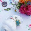 Hoạ tiết mang tên Berkely với khối vẽ xanh ngọc lam sáng và những bông hồng Anh quốc đi kèm hoa liti giữa nền gốm trắng và những nét hoa vàng nâu bổ trợ.