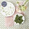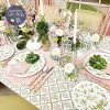 Khăn bàn như nhưng giàn hoa bắc xanh lá tươi nhẹ điểm hoa hồng phấn tạo không gian xanh, mát mắt và tươi tắn.