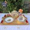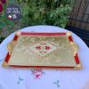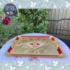 Khay mạ vàng và vẽ, khắc tỉ mỉ của nghệ nhân Florence đẹp cổ điển, sang trọng. Bên cạnh những mảng mạ vàng mờ đậm xen kẽ những lối chạm trổi sao, chạm trổ rộng là những mảng mạ vàng mờ tạo chiều sâu không hề giản đơn của chiếc khay. Đường viền đỏ và những hoạ tiết nhấn sơn đỏ trung tâm khay tạo vẻ đẹp hoàn thiện.