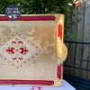 Khay mạ vàng và vẽ, khắc tỉ mỉ của nghệ nhân Florence đẹp cổ điển, sang trọng. Bên cạnh những mảng mạ vàng mờ đậm xen kẽ những lối chạm trổi sao, chạm trổ rộng là những mảng mạ vàng mờ tạo chiều sâu không hề giản đơn của chiếc khay. Đường viền đỏ và những hoạ tiết nhấn sơn đỏ trung tâm khay tạo vẻ đẹp hoàn thiện.
