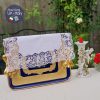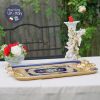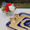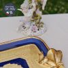 Vẻ đẹp của khay còn được tô điểm bởi tài vẽ hoa chi tiết trung tâm khay trên nền sơn trắng cổ và trung tâm khay nhấn màu xanh cobalt hoàn thiện tổng thể khay với 4 góc khay chạm khắc mạ vàng như vảy sò rất đặc trưng của TOP nghệ nhân làm khay Florence.