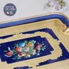 Khay vẽ chi tiết tỉ mỉ của nghệ nhân bậc thầy và sử dụng nhiều kĩ thuật chạm khắc và mạ vàng mĩ mãn. Màu xanh Cobalt trầm sâu đi với mạ vàng khi nhìn bằng mắt thường có sức hút mãnh liệt.