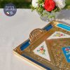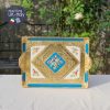 Vẻ đẹp của khay còn được tô điểm bởi tài vẽ hoa chi tiết trung tâm khay trên nền sơn trắng cổ và trung tâm khay nhấn màu xanh cobalt hoàn thiện tổng thể khay với 4 góc khay chạm khắc mạ vàng như vảy sò nên thơ.
