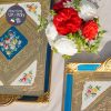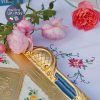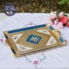 Vẻ đẹp của khay còn được tô điểm bởi tài vẽ hoa chi tiết trung tâm khay trên nền sơn trắng cổ và trung tâm khay nhấn màu xanh cobalt hoàn thiện tổng thể khay với 4 góc khay chạm khắc mạ vàng như vảy sò rất đặc trưng của TOP nghệ nhân làm khay Florence.