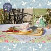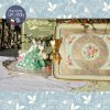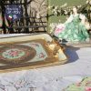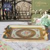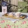 Đường bo khay xanh màu Tiffany pha tài tình của nghệ nhân Florence hiện hài hoà với những nét vẽ bó hoa hồng cổ điển e ấp trong trung tâm khay rồi 4 góc khay của bông hồng vàng nghệ, đỏ hồng nhẹ nhàng.